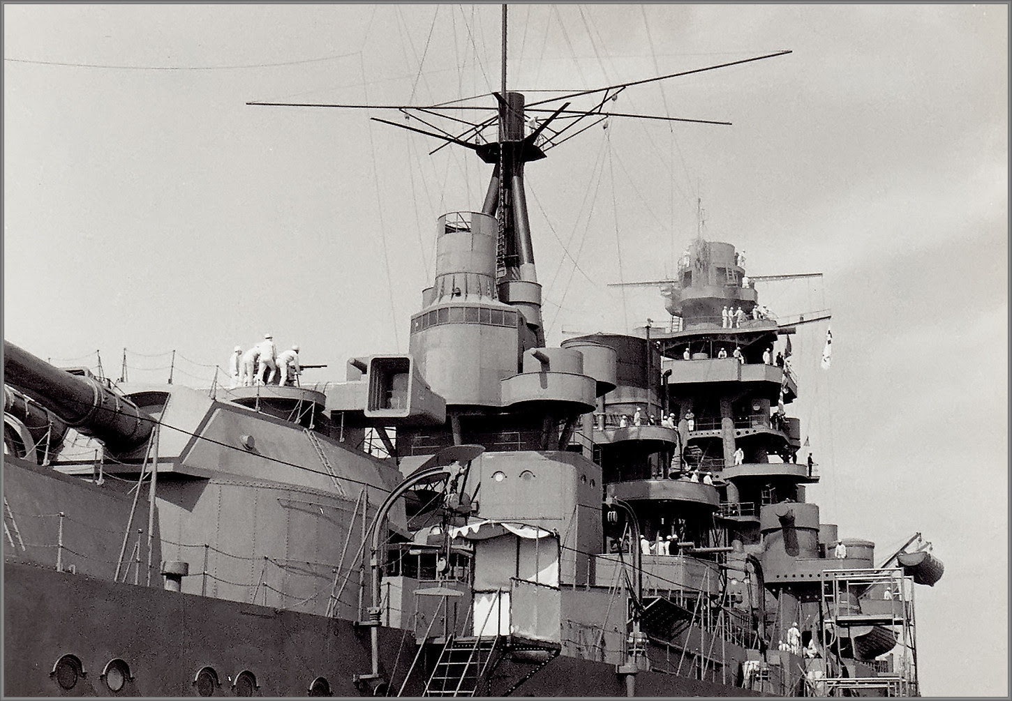 She is missing her upper forward (Q) turret that was removed at the Tyne shipyard in January-February 1944 to lessen top weight (see reference below).